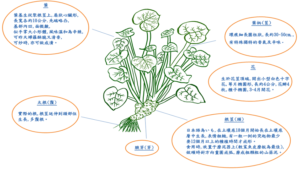 山葵原產於中國、日本,又稱「山嵛菜」,屬十字花科草木植物,地下根莖細長節狀,有葉柄脫落痕跡,葉簇生,心臟形狀有長葉炳,山葵的根、莖、葉都可食用。味道強烈但具有草木清香,帶有些微甜味。
