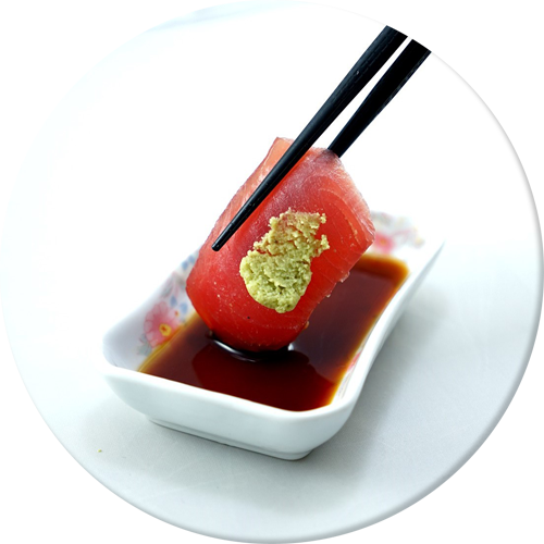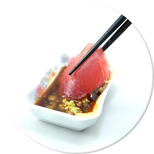 將山葵對生魚片的一側,醬油觸碰生魚片的一角,您可以品嘗山葵令人興奮的氣味,包含在辛辣中的甜味。